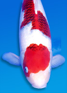 This is a white koi with the hi pattern similar to Kohaku, but each red scale is edged in black or dark blue, reminiscent of their Asagi ancestry. Good Ai Goromo are judged much like good Kohaku, with all the qualities expected of that variety: snow-white skin, deep crimson hi, and an interesting traditional or modern pattern. The dark lining along the scales appears only faintly when the koi is young and may take years to come out fully. Too much sumi early in life is an indication that this color will eventually overwhelm the koi. But in mature koi, the sumi should be evenly distributed over all patches of hi, with the exception of the head. |