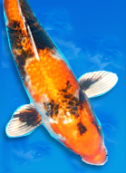 The aristocrat of Hikarimoyo is the metallic Sanke known as Yamatonishiki. This variety came on to the market in the 1960s from two distinct sources, the first breeder being Seikichi Hoshino, who took 15 years to develop it. The complex process involved an initial cross between an Asagi and a Kin Kabuto and subsequent introductions of Sakura Ogon blood. A similar fish - Koshi-nishiki - was bred in Yamakoshi by crossing a Yamabuki Doitsu with a Gin Showa. Both are now grouped together as Yamatonishiki. |