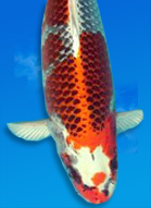 Kujaku are highly regarded by the Japanese, as the patterning on a good specimen can rival that of Sanke. Like Goshiki, they are said to be five-colored koi. The first ones were bred in Ojiya in 1960 by Toshio Hirasawa from a female Shusui and a male Kin Matsuba and Hariwake. (Koi are normally spawned in trios, with one female and two males. It is therefore impossible to establish the exact parentage of the first Kujaku.) The result was a metallic platinum fish with black Matsuba scalation overlaying a hi pattern, a clear red head, and some blue derived from the original female parent koi. Many of these first Kujaku (the word literally means "peacock") were Doitsu, again the result of the Shusui influence. |