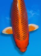 Matt-scaled Matsuba are grouped in Kawarimono, but their metallic equivalents are benched Hikarimono. The most commonly available are Kin Matsuba (metallic gold/yellow, first produced in 1960) and the Gin Matsuba, its silver equivalent. Platinum (white) Matsuba and Aka Matsuba Ogon are not often seen. The pinecone scalation must be pronounced; if the black is more of a gray, these koi look washed out. Beginners are often confused by the Doitsu Matsuba Ogon, as the scale reticulation is not present. Instead, the black, German scales are aligned in the usual position, where they contrast sharply with the metallic body. Orange Doitsu Ogonare very rare. |