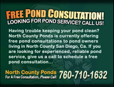 If your pond is new or old, large or small, North County Ponds is trained in a variety of pond care services including regular pond maintenance, on-call pond services, pond clean-outs, complete filter system installs, pond water treatments, system cleanings, pond sealing, koi medicating, koi and fish care, algae control, aquatic plant care, and all other aspects of pond and lake management. Call North County Ponds at 760-710-1632 for questions, pricing info, or to schedule a free pond consultation. |