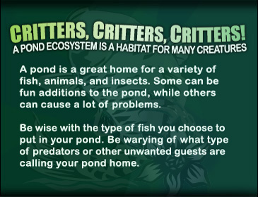 Pond ecosystems invite a variety of life. Most pond owners build their ponds with plans of keeping exotic, beautiful Japanese koi fish. While colorful koi fish are the main attraction, there are other types of animals, that you may or may not choose, looking for a pond to call home or a place to find food. It is a good idea to be aware of the types of critters that you will find in your typical backyard pond habitat. |