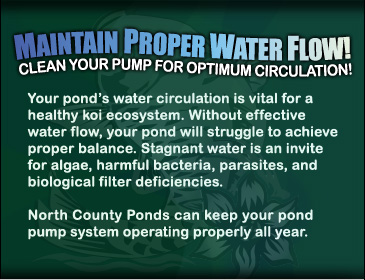 North County Pond’s is trained in basic maintenance for a variety of pond pump systems. We know how to guarantee optimum water circulation for your pond. |