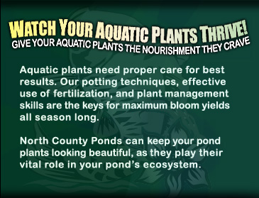 If your pond is new or old, large or small, North County Ponds is trained in a variety of pond care services including regular pond maintenance, on-call pond services, pond clean-outs, complete filter system installs, pond water treatments, system cleanings, pond sealing, koi medicating, koi and fish care, algae control, aquatic plant care, and all other aspects of pond and lake management. Call North County Ponds at 760-710-1632 for questions, pricing info, or to schedule a free pond consultation. |