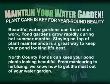Cardiff pond maintenance, Carlsbad pond maintenance, Carmel Valley pond maintenance, Del Mar pond maintenance, Encinitas pond maintenance, La Costa pond maintenance, LaJolla pond maintenance, Leucadia pond maintenance, North County pond maintenance, Point Loma pond maintenance, Poway pond maintenance, Rancho Santa Fe pond maintenance, San Diego pond maintenance, and San Marcos pond Maintenance. North County Ponds and Rancho Santa Fe pond service. North County Ponds 760-710-1632 P.O. Box 8053 Rancho Santa Fe, California 92067. North County Ponds is north San Diego's best pond cleaning and pond maintenance service pond cleaning service. For a clean, healthy, beautiful pond, our pond maintenance is second to none. We are pond service professionals and are passionate about clean, healthy koi ponds. Let North County Ponds care for your koi pond. Keep your pond beautiful! Call us today for a free pond consultation: North County Ponds (760-710-1632) Dirty pond? North County Ponds is the answer for clearer, cleaner pond water, pond muck removal, aquatic plant management, pond algae control, pond filter and pond pump maintenance, pond equipment installation, koi health, pond health, and general pond and lake management. North County Ponds services the greater area of north San Diego county including: Rancho Santa Fe ponds, Del Mar ponds, La Jolla ponds, Carmel Valley ponds, Solana Beach ponds, Encinitas ponds, Carlsbad ponds, and Fallbrook ponds. |